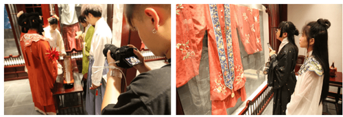 隨后,參會嘉賓與院校師生們一起參觀洋溢著國風古韻的“池上錦”漢服特色產業街區,并與街區品牌商戶進行互動交流,體驗漢服文化的豐厚底蘊。
