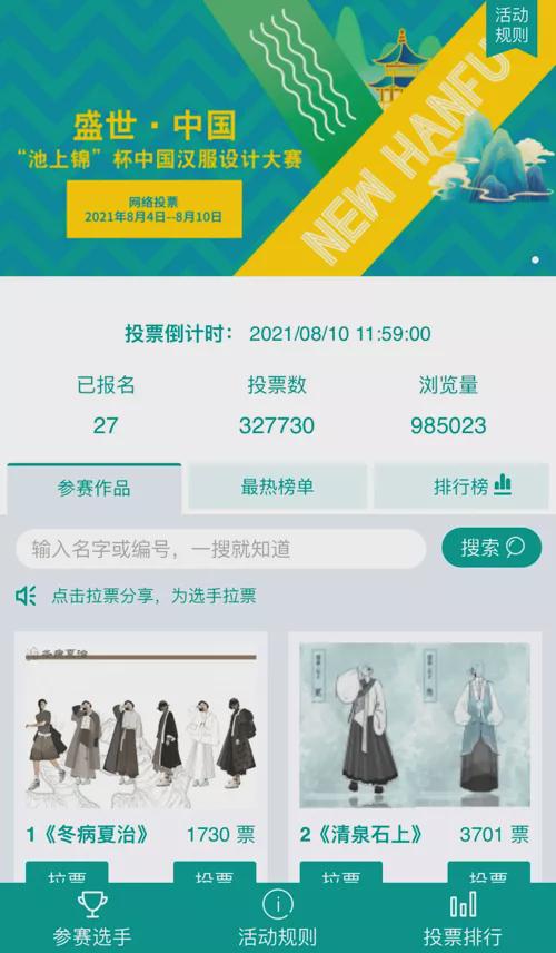 投票火熱 吸引百萬流量關注 本次大賽網絡投票通道于8月10日11時59分正式關閉,自8月4日投票開啟以來,全網設計愛好者及漢服同袍們反響熱烈。25份初評入圍作品激烈角逐,共吸引了近百萬人次參與互動,讓入圍選手們倍感興奮。 依據大賽組委會網絡投票環節規則,最終,11號選手余凌風作品《曲韻腔調》獲得25090票,成為本次大賽名副其實的“人氣王”、“流量收割機”,率先捧走本次大賽的網絡人氣大獎。