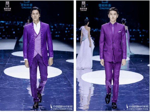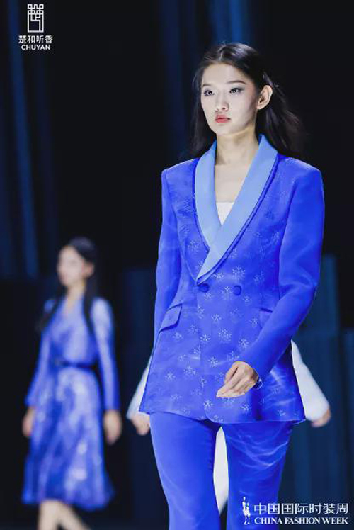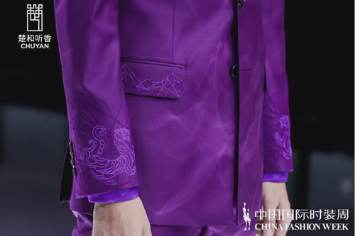 “楚和聽香”本季發布會也根據當下的生活場景和著裝需求,男裝結合了世界通行的夾克、西裝、獵裝等服裝的版型和結構特點,女裝則結合了西式套裝、禮服的裙撐等元素,融入了中國色、中國的圖案和工藝,整體風格統一,又富于豐富的變化,中西合璧,融通古今。