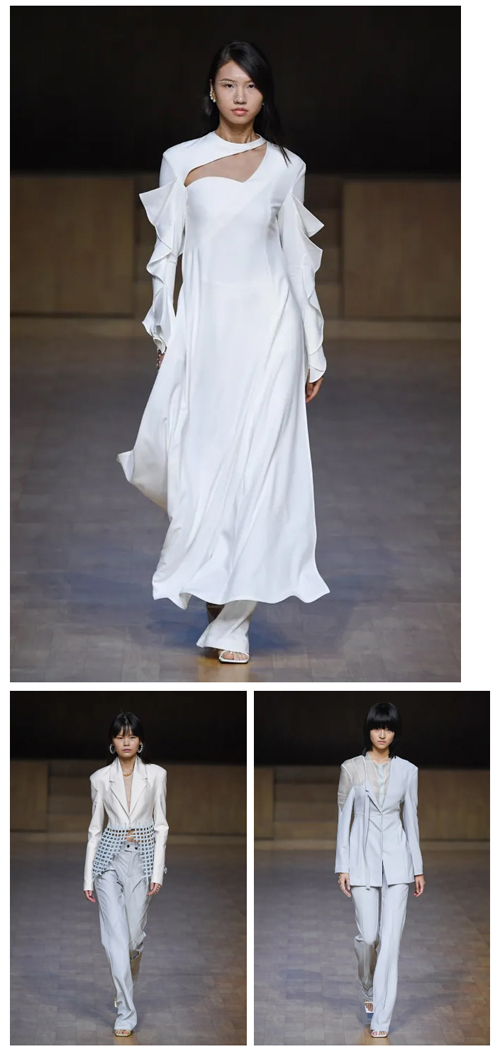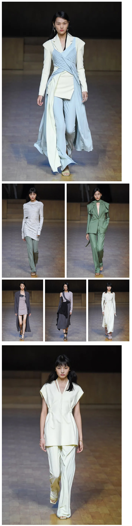 溫和的顏色是本季的主要構(gòu)成,以淡淡的雅米黃、芬芳的薄荷綠、溫暖的晚沙粉等中性自然色系為主基調(diào),如午后窗外的景色,讓人仿佛置身其中享受屬于自己的時間。服裝款式方面,設(shè)計師依然注重女性的力量感、收腰與肩部的設(shè)計、自然的褶皺設(shè)計、不規(guī)則的裁片設(shè)計,延續(xù)了品牌一貫的設(shè)計風(fēng)格。在簡單的廓形下營造不同的小細(xì)節(jié),好像時間的結(jié)扣,每一個都有不同的意義。SS22的面料拋棄了圖案,回歸自然的純凈,單色的面料之間進(jìn)行不同的碰撞,運(yùn)用編織、拼色等服裝工藝,就像經(jīng)紗和緯紗在進(jìn)行時間的碰撞。無論是色彩、款式還是面料,陳龍都無意間做出了“讓步”,起到留白的作用。讓時間的禮物,填補(bǔ)每個人不同的空白。