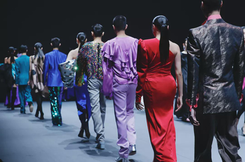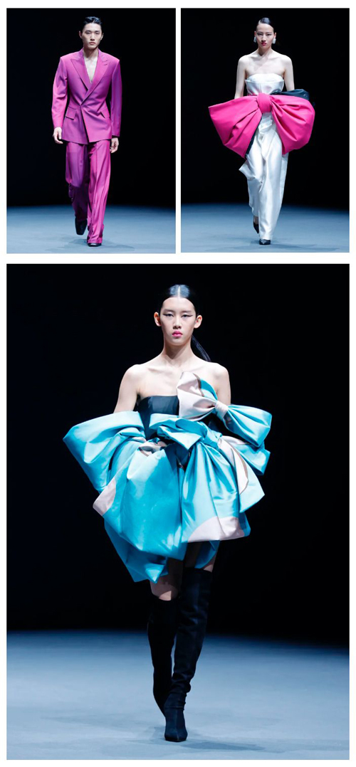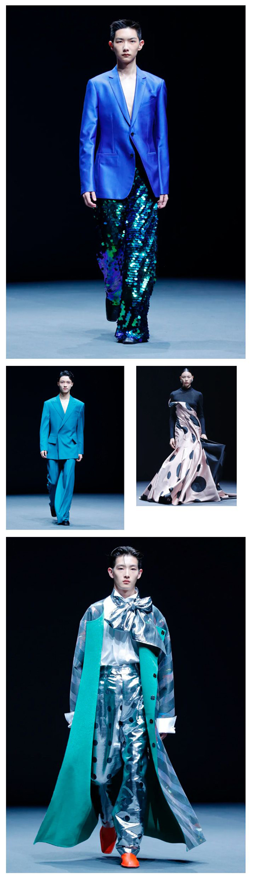 秀場保持一貫的簡約和復古,設計師將所有的力度都釋放在服飾上,不外露丁點兒“春光”,一切靠設計說話。復古爵士讓整場秀陷入一種從容的“微醺”中,可以忘卻一切“創傷”,在王鈺濤的“撫摸”中逐漸恢復如初。他的設計視野并不局限于服裝,而是構建了一種時裝建筑的敘事結構,營造出強烈的戲劇性,從立體結構處揮灑屬于自己的王者風范。本季,Beautyberry嘗試了更大膽的色彩,游移在“過分”的臨界點,毫厘間崩塌的錯覺呼應著疫情時代的苦難,崩潰前的治愈反而讓觀眾莫名松弛。在不規則褶皺和波點戲謔的對話中,偶爾出現的亮片閃爍著令人愉悅的光點。在情緒被撫慰的同時,王鈺濤并沒有松懈對性感線條的塑造,在利落復古的高級馬尾下流淌著細膩的曲線。生動地呈現50年代高級定制禮服的極致,又不拘泥于復古框架的局限,在節制的典雅中融入當代浪漫主義的微妙,賦予王鈺濤獨有的標簽:犀利的眼神背后溫暖的笑意,“炮制”美麗的同時讓你重新快樂。