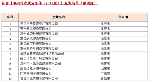 經企業自主申報、省級工業和信息化主管部門核實推薦、專家組評審及現場復核、征求生態環境部意見、對外公示等程序,現將符合《印染行業規范條件(2017版)》企業名單(第四批)予以公告。