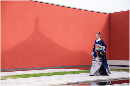 設計師張義超作品 身著創意漢服的模特與紅墻宮闕結合體現出別具風味的東方古典意境,宛如蘇軾那一句千古傳誦的名句——“不知天上宮闕,今夕是何年?”