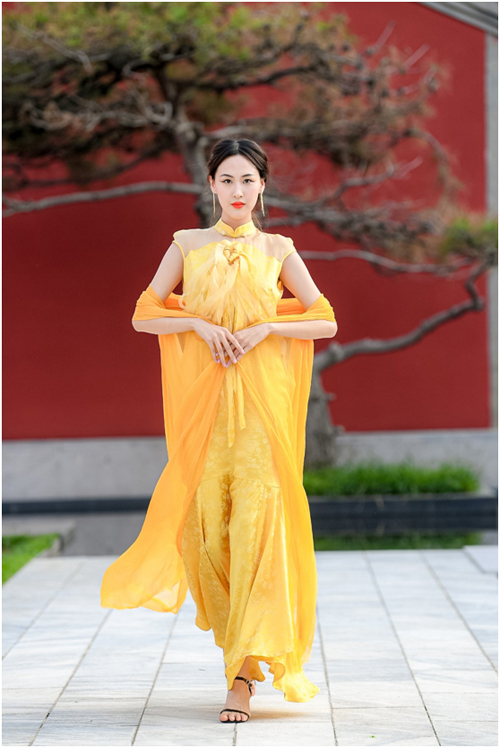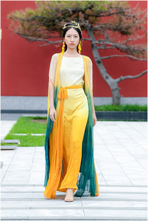 設計師張義超作品 愉悅YUE BAST首席設計師王恕兒本次作品“萬物幻彩染華章”則呈現出另一種風貌:服裝的色彩選擇融入敦煌色系的元素,從大自然中的獲取色彩靈感,以幻彩呈現,簡約而典雅的廓型設計,采用廓形收腰等工藝設計加上桑蠶絲等天然面料的點綴,在順垂感中展現此系列的靈動脫俗之美。