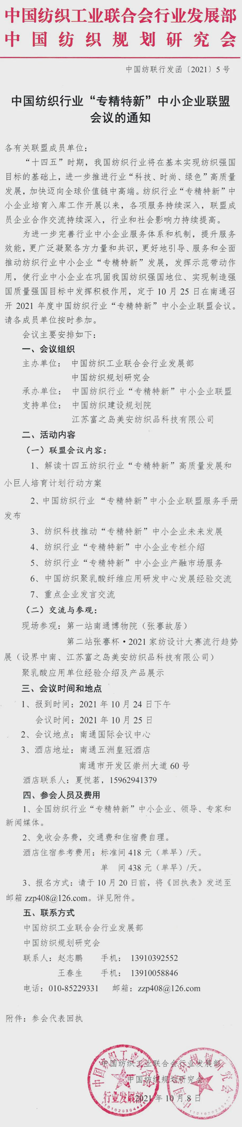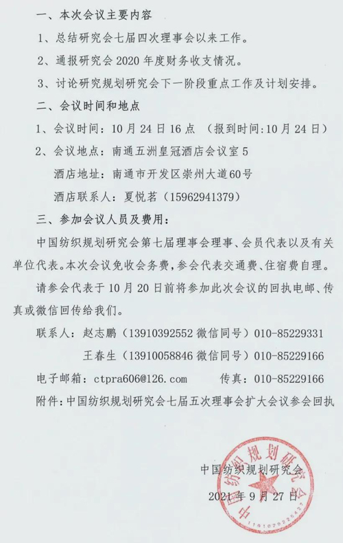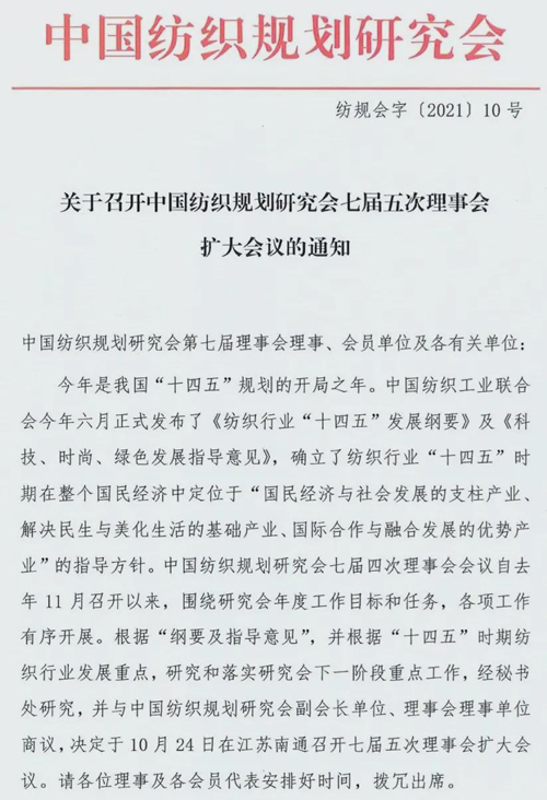 今年是我國“十四五”規劃的開局之年。中國紡織工業聯合會今年六月正式發布了《紡織行業“十四五”發展綱要》及《科技、時尚、綠色發展指導意見》,確立了紡織行業“十四五”時期在整個國民經濟中定位于“國民經濟與社會發展的支柱產業、解決民生與美化生活的基礎產業、國際合作與融合發展的優勢產業”的指導方針。中國紡織規劃研究會七屆四次理事會會議自去年11月召開以來,圍繞研究會年度工作目標和任務,各項工作有序開展。根據“綱要及指導意見”,并根據“十四五”時期紡織行業發展重點,研究和落實研究會下一階段重點工作,經秘書處研究,并與中國紡織規劃研究會副會長單位、理事會理事單位商議,決定于10月24日在江蘇南通召開中國紡織規劃研究會七屆五次理事會擴大會議。