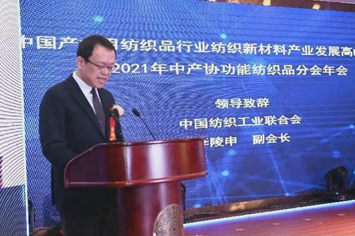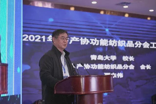 ![]() 青島大學(xué)校長、中產(chǎn)協(xié)功能紡織品分會會長夏東偉作2021年功能紡織品分會工作報(bào)告。
