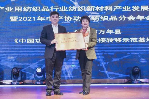 ![]() 中國產(chǎn)業(yè)用紡織品行業(yè)協(xié)會會長李桂梅為萬年縣授《中國功能紡織品產(chǎn)業(yè)承接轉(zhuǎn)移示范基地》牌匾。