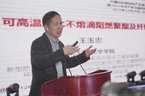 ![]() 中國工程院院士、四川大學(xué)教授王玉忠作了“可高溫炭化不溶滴阻燃聚酯及纖維”主題報(bào)告。王玉忠指出,傳統(tǒng)阻燃方法存在溶滴問題,這也是阻燃領(lǐng)域長期未解決的國際難題。他說,通過分子設(shè)計(jì),在聚酯大分子鏈中引入可高溫自交聯(lián)基團(tuán),使共聚酯在高溫或燃燒溫度下快速發(fā)生快速“化學(xué)交聯(lián)”,進(jìn)而炭化,從而實(shí)現(xiàn)不溶滴和高阻燃性的目標(biāo),并且熱釋放速率和煙密度都顯著下降。