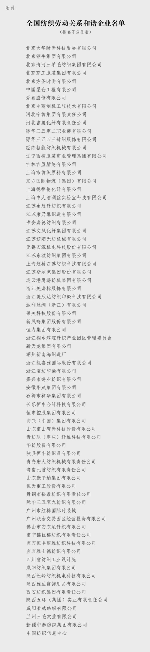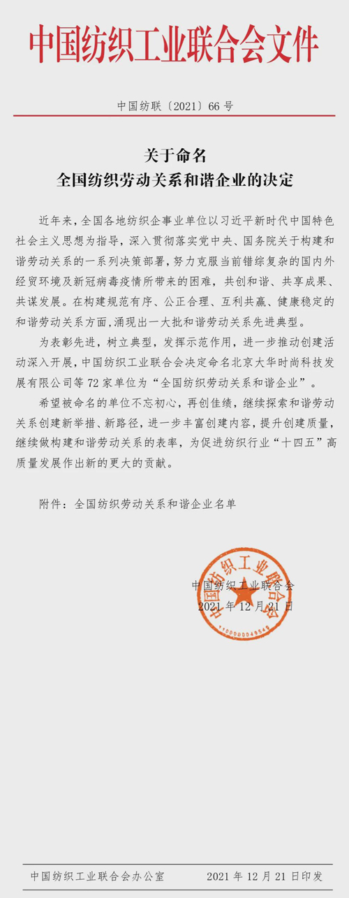 近年來,全國各地紡織企事業單位以習近平新時代中國特色社會主義思想為指導,深入貫徹落實黨中央、國務院關于構建和諧勞動關系的一系列決策部署,努力克服當前錯綜復雜的國內外經貿環境及新冠病毒疫情所帶來的困難,共創和諧、共享成果、共謀發展。在構建規范有序、公正合理、互利共贏、健康穩定的和諧勞動關系方面,涌現出一大批和諧勞動關系先進典型。 為表彰先進,樹立典型,發揮示范作用,進一步推動創建活動深入開展,中國紡織工業聯合會決定命名北京大華時尚科技發展有限公司等72家單位為“全國紡織勞動關系和諧企業”。