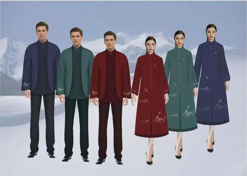 ![]() 據了解,江蘇陽光集團除了為國家冬季運動管理中心設計制作了西服套裝系列以外,同時還設計制作了一套中式禮服系列,服裝的靈感源自中國傳統山水畫《千里江山圖》和冬奧核心圖形中的“賽區山行”。