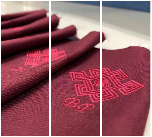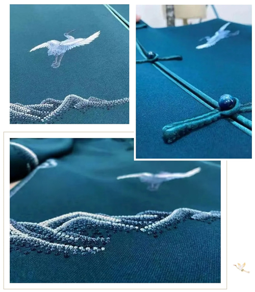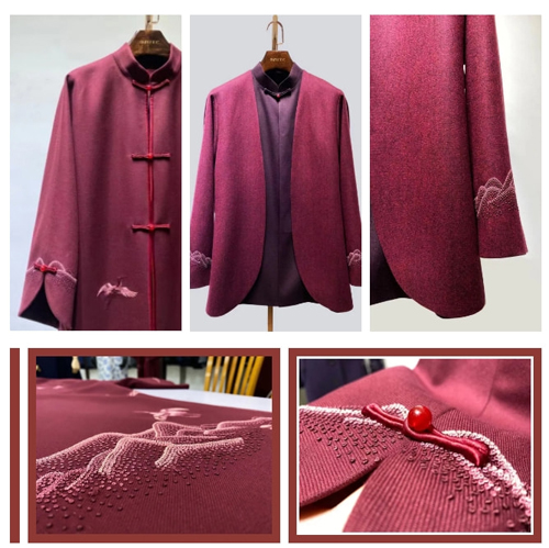 ![]() 該中式禮服系列的設計過程中,修改方案總共達十余次,共計84套方案,根據方案開發了38款面料,服裝上的繡花從開始的機繡、法式繡,到最終采用具有“平、齊、細、密、和、光、順、勻”特點的“蘇繡”工藝。每一套服裝均為量身定做,通過細膩的針法,將穿著者名字的英文縮寫繡在服裝的后領貼處,在強調科技創新的現代化運用同時,體現東方文化“以人為本”的匠人手作,傳遞富有溫度的國家情誼。
