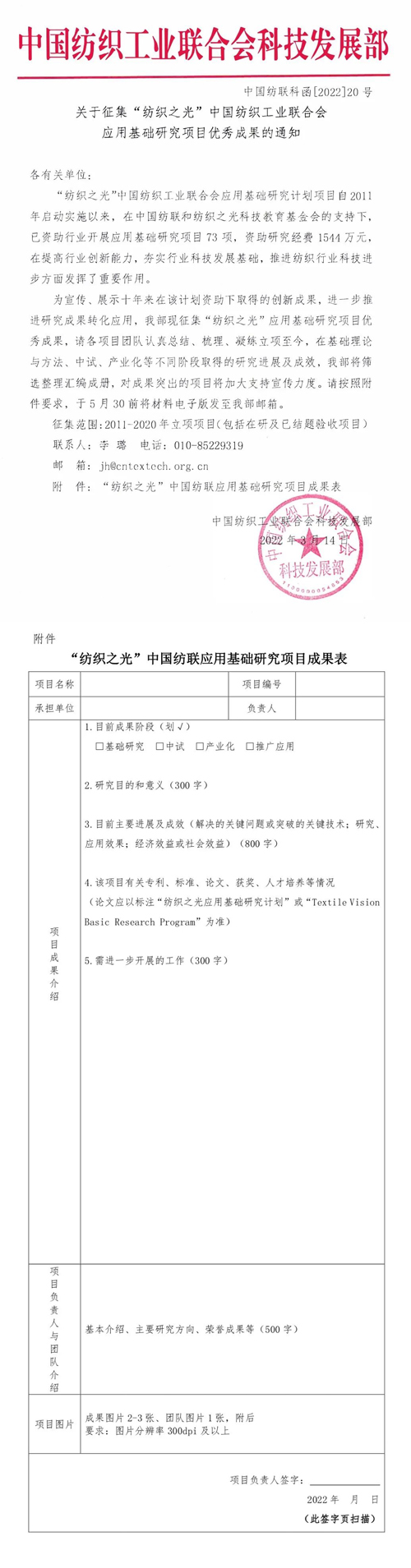 為宣傳、展示十年來在該計劃資助下取得的創新成果,進一步推進研究成果轉化應用,中國紡聯科技發展部現征集“紡織之光”應用基礎研究項目優秀成果,請各項目團隊認真總結、梳理、凝練立項至今,在塟礎理論與方法、中試、產業化等不同階段取得的研究進展及成效,中國紡聯科技發展部將篩選整理匯編成冊,對成果突出的項目將加大支持宣傳力度。