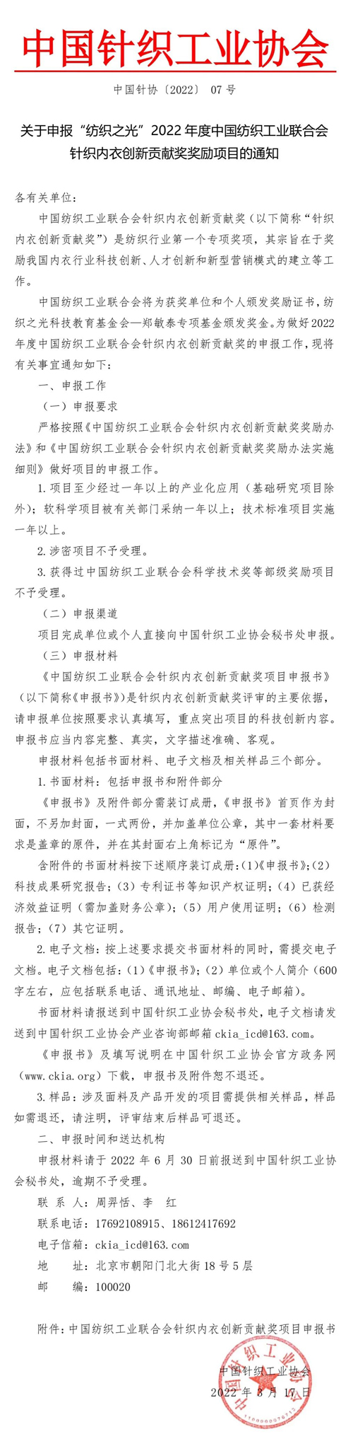 中國(guó)紡織工業(yè)聯(lián)合會(huì)針織內(nèi)衣創(chuàng)新貢獻(xiàn)獎(jiǎng)(以下簡(jiǎn)稱(chēng)“針織內(nèi)衣創(chuàng)新貢獻(xiàn)獎(jiǎng)”)是紡織行業(yè)第一個(gè)專(zhuān)項(xiàng)獎(jiǎng)項(xiàng),其宗旨在于獎(jiǎng)勵(lì)我國(guó)內(nèi)衣行業(yè)科技創(chuàng)新、人才創(chuàng)新和新型營(yíng)銷(xiāo)模式的建立等工作。 中國(guó)紡織工業(yè)聯(lián)合會(huì)將為獲獎(jiǎng)單位和個(gè)人頒發(fā)獎(jiǎng)勵(lì)證書(shū),紡織之光科技教育基金會(huì)—鄭敏泰專(zhuān)項(xiàng)基金頒發(fā)獎(jiǎng)金。為做好2022年度中國(guó)紡織工業(yè)聯(lián)合會(huì)針織內(nèi)衣創(chuàng)新貢獻(xiàn)獎(jiǎng)的申報(bào)工作,現(xiàn)將有關(guān)事宜通知如下: