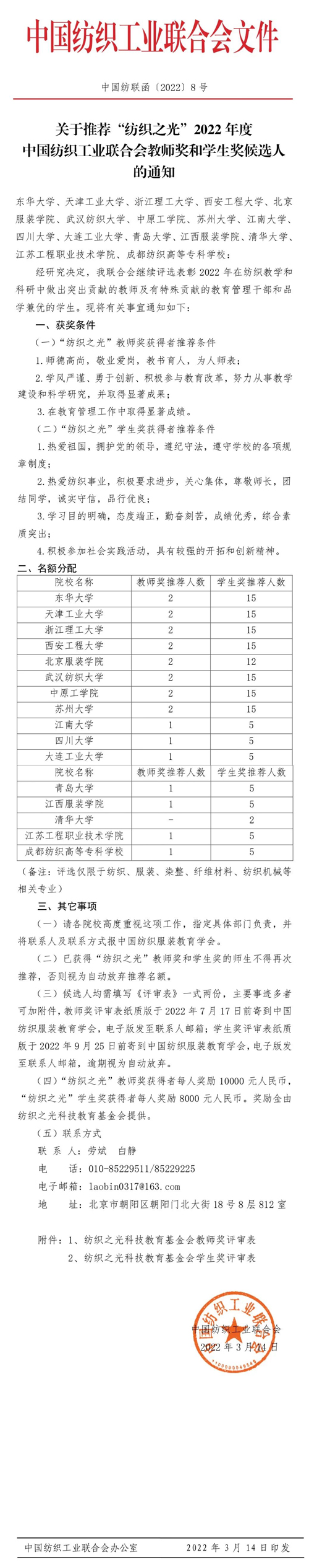 硏究決定,“紡織之光”中國紡織工業聯合會繼續評選表彰2022 年在紡織教學和科研中做出突出貢獻的教師及有特殊貢獻的教育管理干部和品學兼優的學生。現將有關事宜通知如下:
