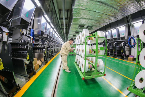 在宿遷盛虹新材料產業園,盛虹投建全球第一條從瓶片到紡絲的再生熔體直紡產線,全面投產后,年產50萬噸再生滌綸絲,年消化350億個舊塑料瓶,占全國回收總量的20%,被循環利用后等于節約380萬噸原油。
