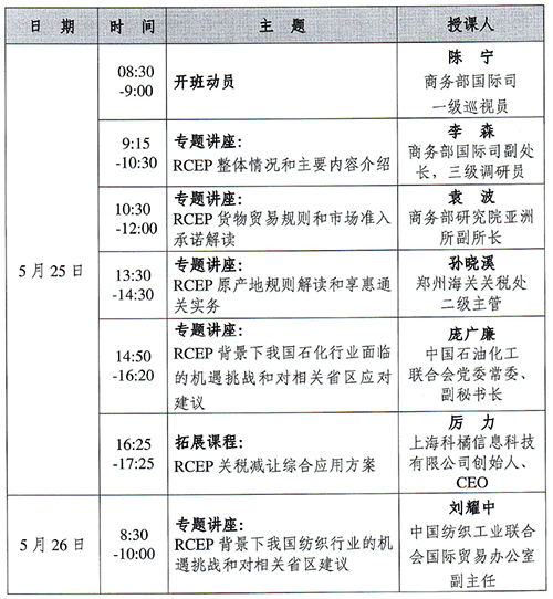RCEP整體情況和主要內(nèi)容介紹;RCEP貨物貿(mào)易規(guī)則和市場準入承諾解讀;原產(chǎn)地規(guī)則解讀及享惠通關(guān)實務(wù);RCEP背景下我國紡織行業(yè)面臨的機遇挑戰(zhàn)和應(yīng)對建議;RCEP成員國貿(mào)易投資風險提示等。