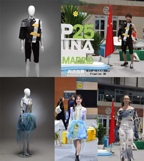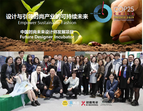 ![]() 2019年10月,中國紡織工業聯合會社會責任辦公室聯合勁霸男裝發起“中國未來設計師種子計劃——衣再造競賽”,從122名選手作品中遴選出的30套中國青年設計師再造衣作品亮相西班牙首都馬德里COP25聯合國氣候變化大會中國角,來自東華大學、中央美術學院的2名設計師代表與劍橋大學、東京大學、清華大學等8所高校環境與氣候領域相關專業研究背景的碩士和博士生共同演繹了 “當可持續時尚遇見氣候變化”的特別行動。隨后,衣再造作品分別在李寧公司總部、2020中國可持續時尚周深圳季和上海季,以及2021中國國際時裝周進行巡回展示。(青年:未來力量之再造時尚的可持續性 )