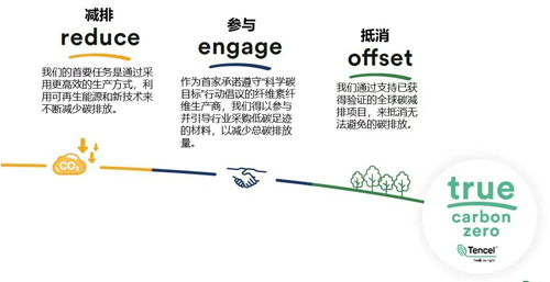 眾所周知,無論企業還是產品的低碳路徑都應該先從自身的降碳開始,而不能完全依賴于抵消。為此,蘭精集團設立了“減排、參與、抵消”三部曲,圍繞減排為重點,開發了凈零碳足跡的天絲?纖維,從纖維源頭減少向下游的碳足跡輸出。