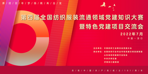 2022年是進入全面建設社會主義現代化國家、向第二個百年奮斗目標進軍的重要一年。做好新時代基層黨建工作,必須堅持用黨的創新理論武裝思想、指導實踐、推動工作。為進一步強化黨員使命意識和責任擔當,更好凝聚精神力量,以優異成績迎接黨的二十大勝利召開,第四屆全國紡織服裝流通領域黨建知識大賽暨特色黨建項目交流會將于7月21-22日在山東省濟南市舉辦。