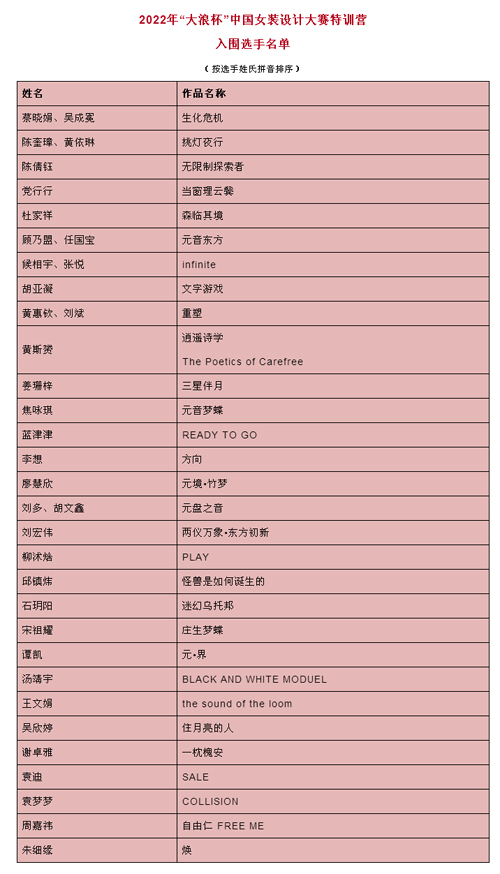 | 2022年“大浪杯”中國女裝設計大賽初評入圍名單公布,30位選手獲得“入營”資格 |