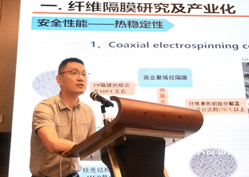 ![]() 江南大學(xué)紡織科學(xué)與工程學(xué)院副院長、教授黃鋒林以“功能性纖維材料研究與產(chǎn)業(yè)用纖維制品開發(fā)”為題,分別介紹了團隊對纖維隔膜材料、抗菌抗病毒功能紡織品的研究及產(chǎn)業(yè)化。他談道,鋰硫電池的高比容量使其成為下一代高能量密度電池的候選者,然而其商業(yè)化進程仍面臨諸多挑戰(zhàn),通過物理磁控沉積技術(shù)對隔膜進行改性,可有效降低電池能量密度,提升電池性能。