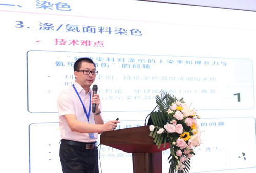![]() 廣東德潤紡織有限公司研發副經理徐斗峰以《針織化纖彈力面料的染整加工生產技術》為題,就針織化纖彈力面料的染整加工生產技術進行了介紹,并分享了自己在生產方面的心得體會。