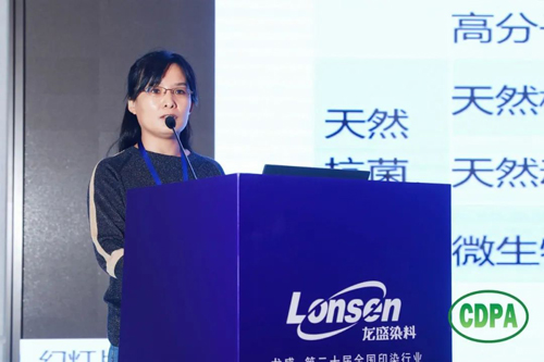 ![]() 山東魯聯新材料有限公司研發中心博士蔣瑩瑩以“紡織品抗菌整理技術”為題,從抗菌劑種類及抗菌機理、抗菌技術新進展、抗菌效果及安全評價以及抗菌紡織品生產現狀及存在問題四個方面進行了分享。她介紹,目前抗菌新技術主要有天然抗菌劑、光催化抗菌劑、反應結合型抗菌劑。抗菌紡織品生產和加工方法,主要有抗菌纖維制備法,如混合紡絲和復合紡絲;后整理法,如表面涂層法、浸軋法和微膠囊法等。紡織品抗菌整理技術雖取得了一定成績,但存在抗菌劑有效期較短,抗菌劑的生態環境安全性不足等問題。