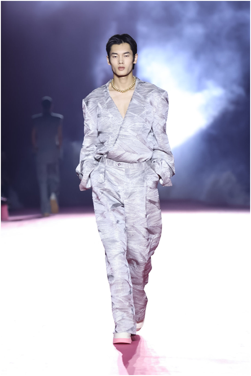 ![]() 在巨型全粉的露天秀場,沒有人可以置身事外,這是在極短的時間里,時裝與藝術最高頻的對話,也是一切細節浮動的精彩時刻。音樂的震動隱匿于服裝的流動中,模特動態的軌跡被強行拽入時代的洪流,靜止般“刺入”視線。本季,男性線條流暢與女性線條的剛硬形成對比,在沖突中用色彩抵達和諧,復古與未來交織,情緒與行為互補,從容踱步,設計理念緩緩流淌,即追溯過往,也啟幕新的紀元。