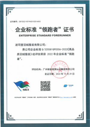 近日,中國標準化研究院在“企業標準領跑者管理信息平臺”公布2022年入選企業標準“領跑者”名單,波司登羽絨服裝有限公司企業標準Q/320581GPC006-2022《高品質羽絨服裝》經評定機構評估,入選2022年企業標準“領跑者”名單并獲頒證書。波司登連續四年榮獲企業標準“領跑者”證書,展現行業領先的企業技術標準,也將助力企業標準化戰略縱深發展,增加中高端產品和服務有效供給,提升羽絨服專家品牌形象和市場競爭力,帶動產業高質量發展。
