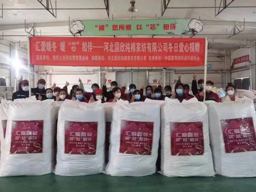 ![]() 此次捐贈是國欣家紡第二次參加“紡織之光?愛益行”活動,公司相關負責人表示,扶弱濟困是中華民族的傳統美德,作為社會群體中的一份子,國欣家紡一直把“感恩、責任、奉獻”作為履行社會責任和義務的標準,國欣人一直踐行的“如果愛,請全愛”,以感恩之心樹立責任意識,以責任意識展現奉獻精神。此次響應中國家用紡織品協會的號召,參與紡織之光?愛益行的公益活動,本著讓貧困地區的同胞感受到冬季溫暖,國欣人以自己的方式匯愛暖冬、暖“芯”相伴,奉獻于社會。公司此次為貧困地區的同胞們送去成人、兒童以及嬰幼兒的一千多套棉衣被物資,就是為了讓社會多一份關愛,人間多一份真情,國欣人衷心祝愿每一位同胞的生活都能無病無災溫馨順遂。國欣家紡將會繼續傳遞愛心接力棒,用國欣人的暖“芯”溫暖到每一位需要的人。