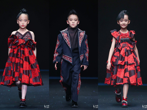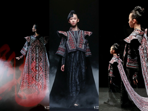 ![]() 壓軸演繹同樣精彩,童模顧賀韻身著設計師歷時4320個小時手工珠繡的高定創意禮服“緋紅云肩·懿彩”壓軸出場,穩健的臺步頗具“武后”之風、將女孩的純真、柔美、堅強、力量展現得淋漓盡致。黑紅主調與開場遙相呼應,碰撞出宇宙源頭之力。