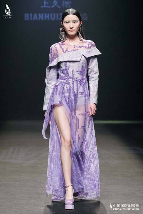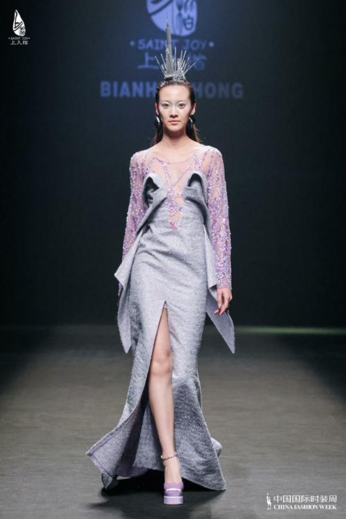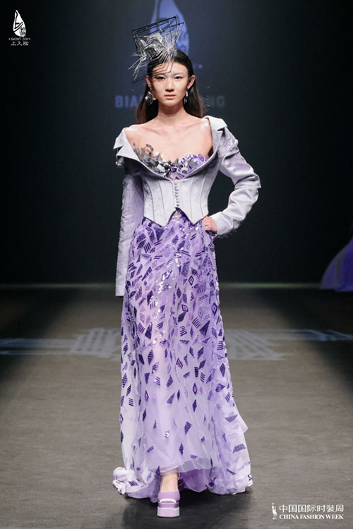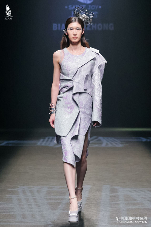 ![]() ![]() 比如說,凹凸的異形金屬建筑裝飾呈現在宋錦裙裝的領口,在為廓形賦予深層次的精神內核的同時,亦是一種表達未來感的獨到嘗試;在淺紫禮服裙身上,設計師以宋錦為載體,加以亮片打造幾何樹葉圖形,暗示著過去每個歷史階段服裝的風貌形態都千差萬別,這閃爍出的點點星光,讓人們聯想到歲月流逝的崢嶸與華麗。