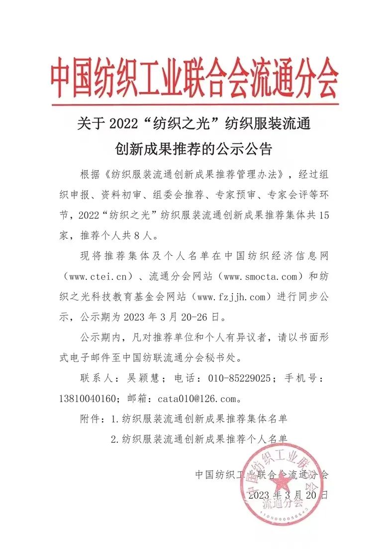 公告提到,現(xiàn)將推薦集體及個人名單在中國紡織經(jīng)濟信息網(wǎng)(www.ctei.cn)、流通分會網(wǎng)站(www.smocta.com)和紡織之光科技教育基金會網(wǎng)站(www.fzjjh.com)進行同步公示,公示期為2023年3月20-26日。