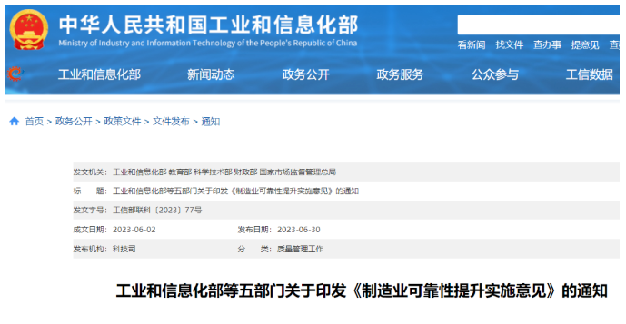 ![]() 日前,工業和信息化部、教育部、科學技術部、財政部、國家市場監督管理總局印發《制造業可靠性提升實施意見》。提出圍繞制造強國、質量強國戰略目標,聚焦機械、電子、汽車等重點行業,對標國際同類產品先進水平,補齊基礎產品可靠性短板,提升整機裝備可靠性水平,壯大可靠性專業人才隊伍,形成一批產品可靠性高、市場競爭力強、品牌影響力大的制造業企業。