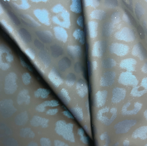 產品特點:底部是光板的針織布,表面是光滑平整的PU。在PU面上印有珠光變色龍效果的豹紋,具有良好的防水效果。