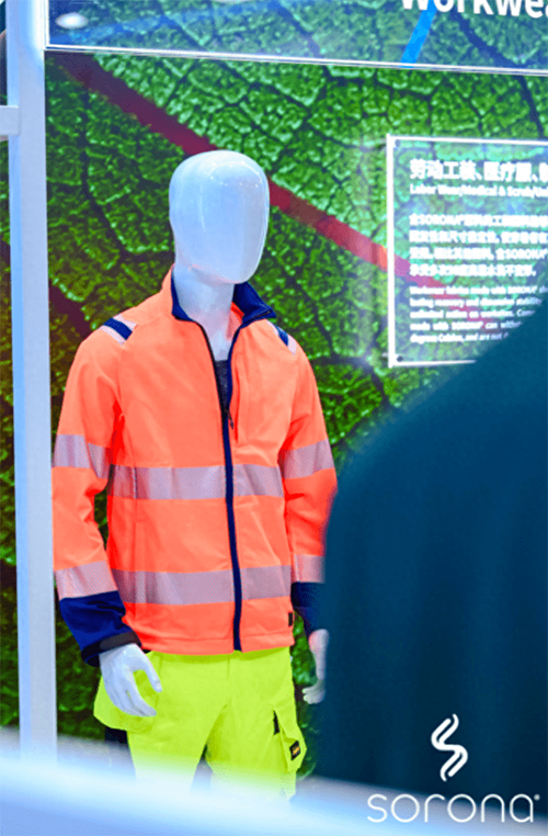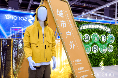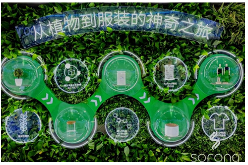來到SORONA?展位,C位的植物墻記錄了SORONA?從誕生到服裝的生命周期歷程。SORONA?生物基材料利用可重復生長的植物性資源,憑借自然界所蘊藏的強大力量,有效降低了生產過程中對石油資源的消耗與碳排放。作為植物來源生物基合成纖維技術的先驅,SORONA?打破傳統纖維產業重度依賴石油和石化產品的局面,從此不再桎梏于傳統時尚工業的高耗能。