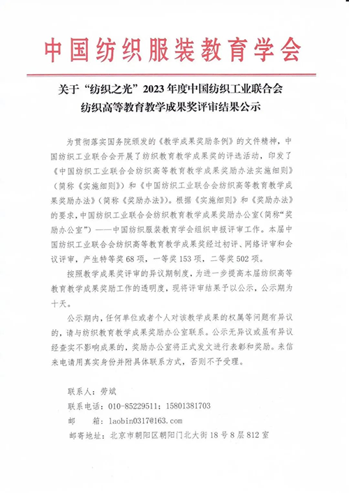 | 關于“紡織之光”2023年度中國紡織工業聯合會紡織高等教育教學成果獎評審結果公示 |