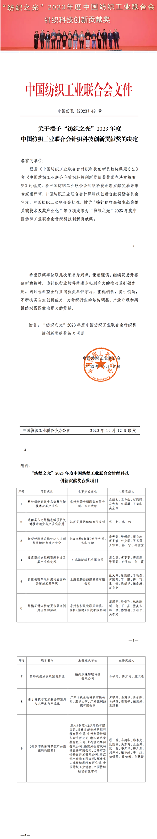 12月19日,由中國紡織工業聯合會與湖北省人民政府共同主辦的2023年中國紡織大會在湖北省武漢市召開,會上發布并表彰了“紡織之光”2023 年度中國紡織工業聯合會針織科技創新貢獻獎。