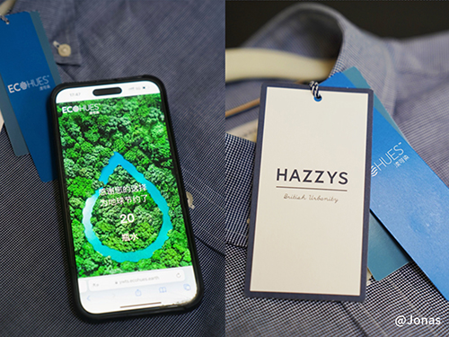今年春夏HAZZYS推出非水染色系列經典商務襯衫,融入湙可染?技術的綠色基因。每生產一件襯衫就可以節省10升水,相當于20瓶飲用水。為了讓消費者更直觀地感受到產品的節水貢獻,溢維環境推出了一個有趣的創意互動形式——在湙可染?吊牌中嵌入NFC芯片,消費者只需用手機觸碰吊牌,就可以輕松訪問湙可染?非水染色認證追溯系統,看到每一件襯衫的生產信息和節水貢獻,這種趣味互動不僅讓品牌和消費者之間建立更緊密的聯系,同時也讓每一份環保行動透明化,引導消費者更加關注環境因素,做出“更負責任”的消費決策。
