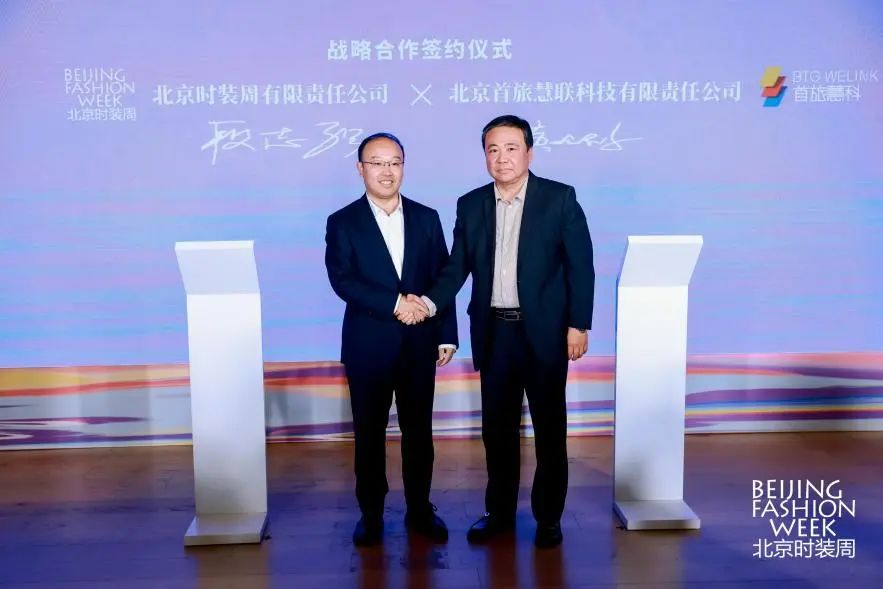 ![]() 北京時(shí)尚控股有限責(zé)任公司董事會(huì)秘書、辦公室主任、北京時(shí)裝周有限責(zé)任公司執(zhí)行董事段志強(qiáng)(左)與北京首旅慧聯(lián)科技有限責(zé)任公司董事、總經(jīng)理黃璐京(右)進(jìn)行戰(zhàn)略簽約
