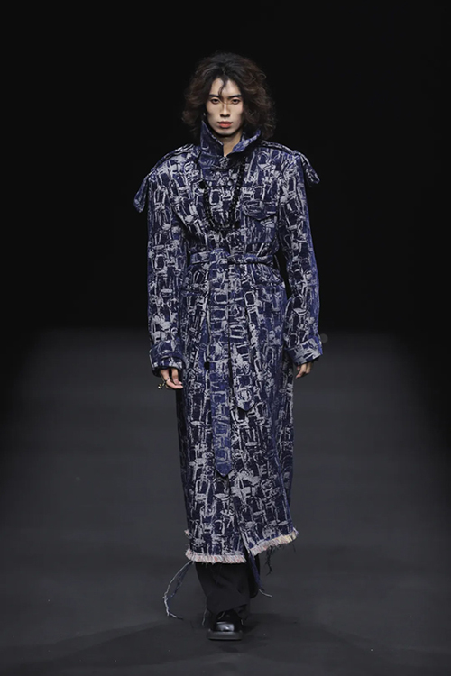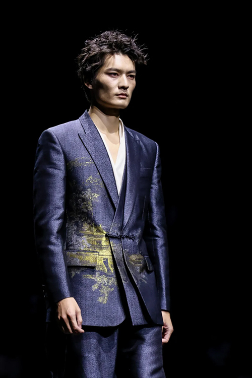 作為頂級織錦宋錦的非遺傳承者,“讓非遺年輕起來”一直都是上久楷探索的方向。本季,設計師運用仿螺鈿紗線刺繡、宋錦羊毛羊絨混織、招財荷包袖以及廓形夾克衫等工藝及款式,繼續將細膩的宋錦與溫柔的羊絨、粗獷的羊毛進行混織,制造出了時尚且耐用的新型提花面料。打破了傳統織造理念,展示出宋錦現代化應用的多面性。