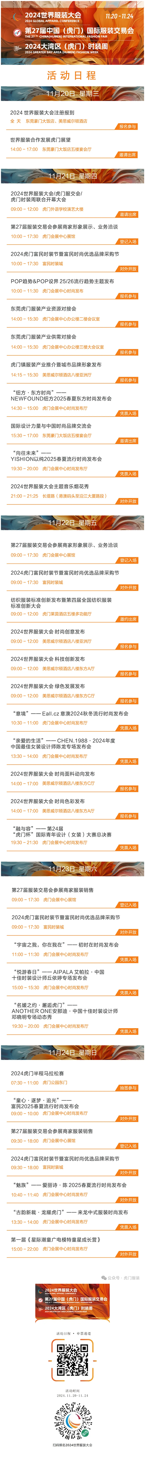 2024世界服裝大會將于11月20 - 22日在虎門舉行,第27屆中國(虎門)國際服裝交易會和2024大灣區(虎門)時裝周將于11月21 - 24日在虎門舉行,實現“三會”聯動?!叭龝甭搫訉Ⅲw現三個重要特點:一是聚焦,“三會”聯動對于各個活動的有機整合,將讓全球來賓集中了解虎門、認同虎門,更多地聚焦到虎門服裝產業發展中,切實促進虎門服裝產業升級。二是做實,通過平臺有效展示共同發展的力量,虎門將啟動兩大聯絡處,做到“開會定主題,閉會做實事”。三是高效,“三會”聯動在短短幾天內,就能高效對接國內外設計、生產、銷售各環節??傮w來說,虎門將按照第一年創平臺、第二年做實事、第三年造品牌的計劃,一年一個腳印,不斷提升虎門服裝的“引領力、凝聚力、責任力、貢獻力”。