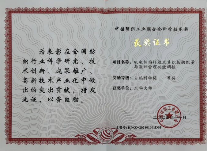 2024年度中國紡織工業聯合會科學技術獎近日揭曉。由東華大學材料學院王宏志教授作為項目第一完成人研發的“機電轉換纖維及其織物的能量與濕熱管理功能調控”項目(以下簡稱“機電轉換項目”),獲得了自然科學獎一等獎。該項目在智能纖維領域實現雙重突破,開創了纖維材料的能量轉換和人體濕熱管理的新途徑。