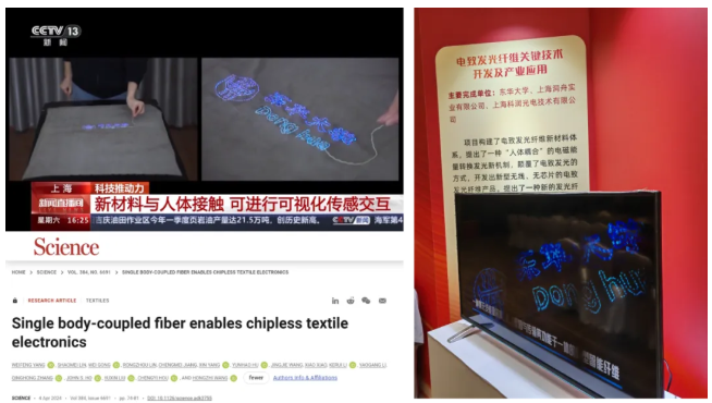 最為引人注目的是團隊開發的一種集能量采集、信號發射和發光顯示于一體的發光纖維技術。這種纖維采用非馮諾依曼架構,通過能量耦合與無線信號發射的深度結合,實現了從功能設計到集成創新的重要突破。發光纖維不僅能夠在復雜環境中高效運行,還具有靈活的可定制特性,可應用于智能服裝、水下救援以及動態標識等多個場景。其獨特的性能和廣泛的應用潛力在團隊發表于《Science》的研究論文中得到了詳細闡述,同時這一技術也被評為紡織領域年度十大科技成果之一。