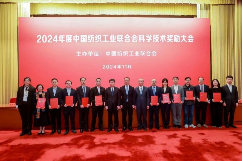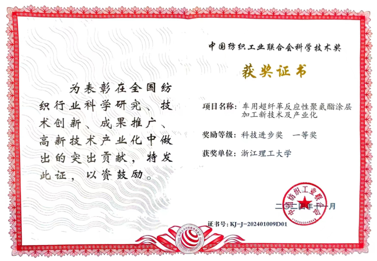 11月12日,中國紡織工業聯合會科學技術獎勵大會在北京人民大會堂舉行,表彰2024年度中國紡織工業聯合會科學技術獎。由現代紡織技術創新中心副主任、浙江理工大學紡織科學與工程學院(國際絲綢學院)戚棟明教授作為項目第一完成人研發的“車用超纖革反應性聚氨酯涂層加工新技術及產業化”項目,榮獲科技進步獎一等獎。
