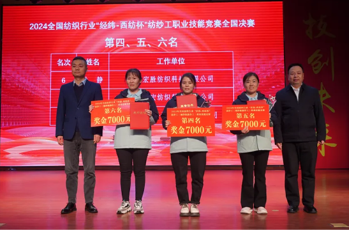 ![]() 中國棉紡織行業協會副會長王耀和陜西省財貿金融輕工工會主席趙亮為全國決賽獲得第4-6名的選手頒獎。