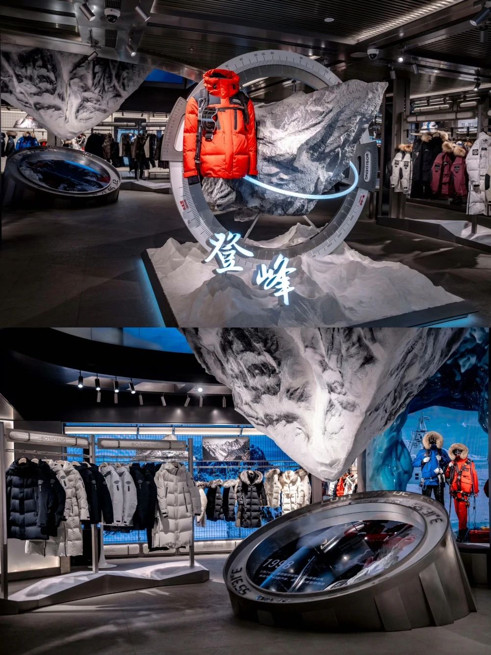 整個(gè)店鋪構(gòu)造分為兩層,一層以“頂峰相見(jiàn)”為主題,劃分為啟程、頂峰、征途、歸來(lái)四個(gè)部分。以珠峰場(chǎng)景為設(shè)計(jì)靈感,象征著的攀頂?shù)闹粮呔窈椭袊?guó)人血脈中的堅(jiān)定信念,寓意波司登對(duì)更高維度的不懈追求,詮釋品牌的登峰基因。二層則以“無(wú)限可能”為主題,通過(guò)南北極地冰川、極光的場(chǎng)景打造,呈現(xiàn)征服極地場(chǎng)景空間,挑戰(zhàn)邊界之外的能量,寓意波司登從登峰造極走向無(wú)限可能,帶來(lái)一場(chǎng)視覺(jué)與心靈的雙重盛宴。