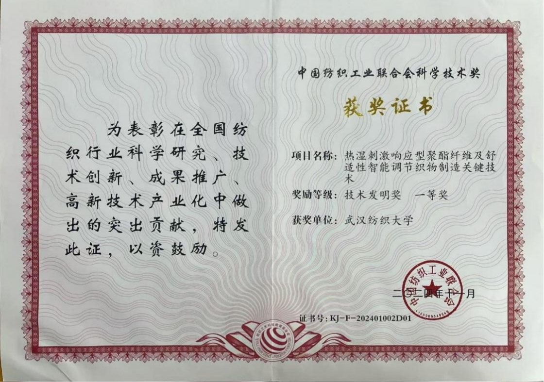 2024年度中國紡織工業聯合會科學技術獎近日揭曉。由武漢紡織大學黨委常委、副校長王棟教授作為項目第一完成人聯合中國石化儀征化纖有限責任公司、福建華峰新材料有限公司、三六一度(中國)有限公司共同研發的“熱濕刺激響應型聚酯纖維及舒適性智能調節織物制造關鍵技術”項目,獲得中國紡織工業聯合會技術發明一等獎。