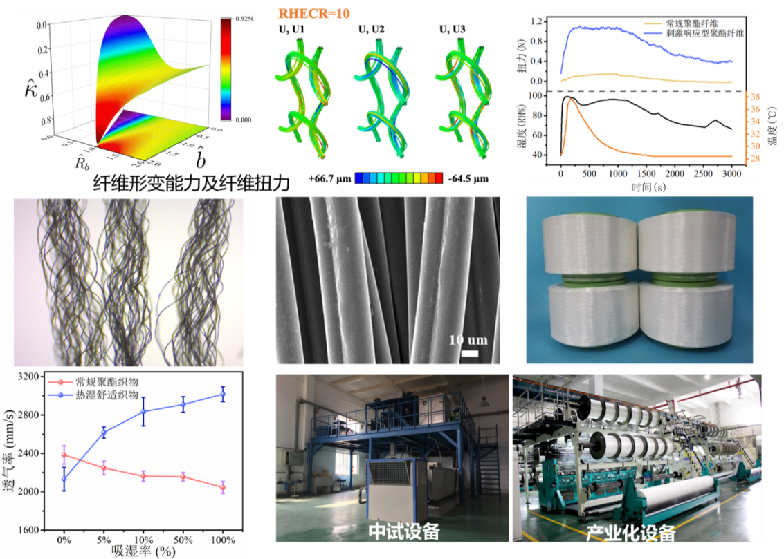 為精確控制新型聚酯纖維的結構,項目創新性地開發了通過單體設計、可控共聚及熔體碰撞紡絲新技術,成功實現了多種規格纖維的產業化生產。這些纖維在熱濕刺激下展現出可逆形變特性,纖維扭力性能比常規纖維提升了5-10倍,為開發具有熱濕舒適性智能調節功能的織物提供了關鍵的纖維材料。