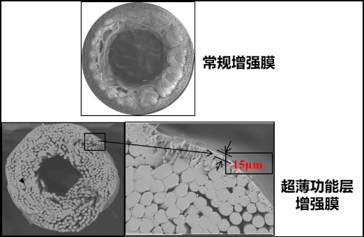 項目直擊印染廢水超濾膜性能薄弱環(huán)節(jié),創(chuàng)新采用 “纖維鎧甲” 策略,即纖維織物增強-復合一步法制膜及膜性能調控和后處理技術。運用立體編織、針織改良和混雜纖維編織及在線定型技術打造高強度纖維增強體,結合復合制膜一步法工藝,成功研發(fā)新型織物纖維增強PVDF中空纖維膜。膜斷裂拉伸強力可達300 N以上,純水通量范圍為 2000~4000 L/(㎡?h),使用壽命長達 5 年以上。與常規(guī)增強膜相比,其優(yōu)勢在于:一是獨創(chuàng)編織法,纖維織物與膜不易剝離;二是具有超薄分離層,僅15微米,通量大幅度提升;三是一步成型,方便產(chǎn)業(yè)化。